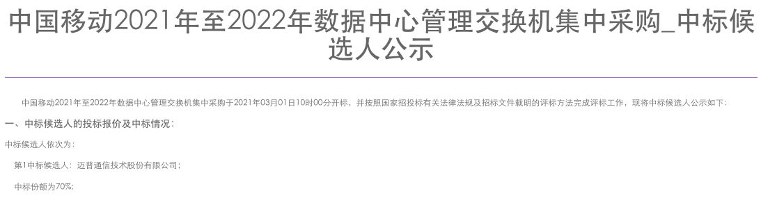 On March 1st, 2021, China Mobile announced the winning bidder for procurement of data center management switch from 2021-2022, in which Maipu won the bid by 70%, involving a purchase of 10,000 sets of data center management switch.